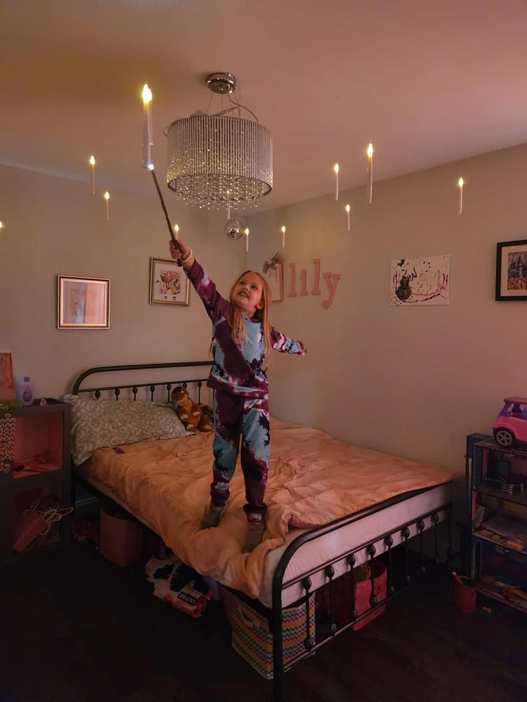 If it cost €100, it would be worth it, so I'm delighted to have paid this small price for great pleasure ✨ when there's no other light than that of candles, you can't see the threads holding them, it really looks like the candles are floating, it's magical! The light flickers like a real candle, it's really beautiful. Perfect for a movie night 🪄Attention, the wand turns the TV on and off 😂 so light your candles before!